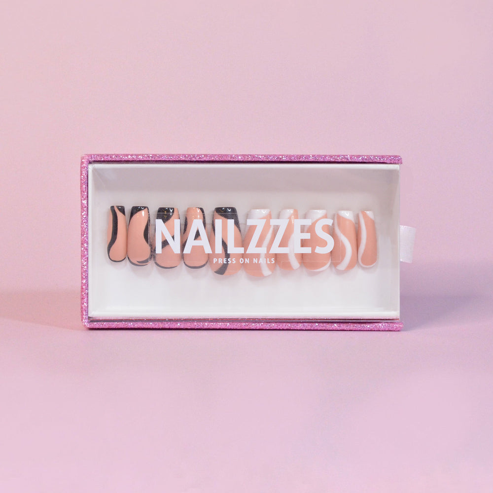Swirl trend se stal již nedílnou součástí nehtového designu. Pokud se ti líbí spíše jednoduché barvy než ty divoké, tohle basic provedení si zamiluješ. Díky technice press-on si je můžeš užít, ať už na jednorázovou událost nebo i během celých dvou týdnů. Stačí si vybrat délku!