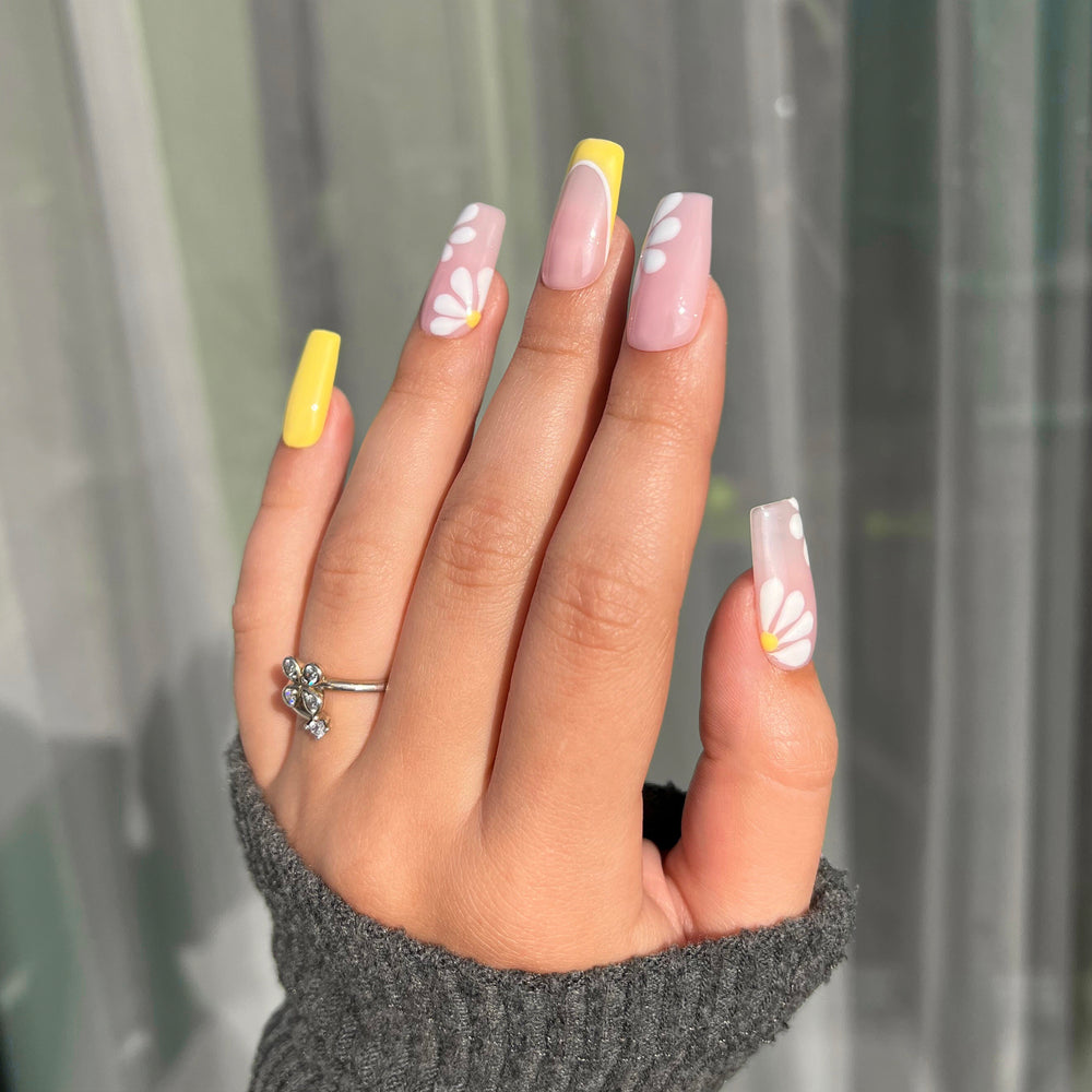Nalepovací nehty Daisies in the Sun kombinují květinový nail art a jemnou francouzskou manikúru v svěžím žluto-bílém provedení. Tento veselý design využiješ i přes slunečné léto. Díky technice press-on si nehty můžeš nalepit, ať už na jednorázovou událost nebo i na celé dva týdny. Stačí si vybrat délku a tvar!