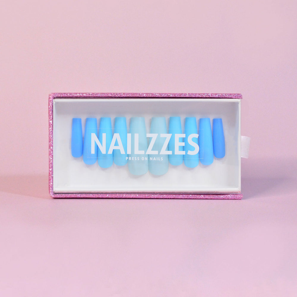 Nalepovací nehty Ocean Blue jsou skvělá volba pro milovníky modré barvy. Krásný design v barevné škále ombré, dokonale doplní každý sluneční den. Díky revoluční technice press-on si nehty můžeš užít, ať už na jednorázovou událost nebo i během celých dvou týdnů. Stačí si vybrat délku!
