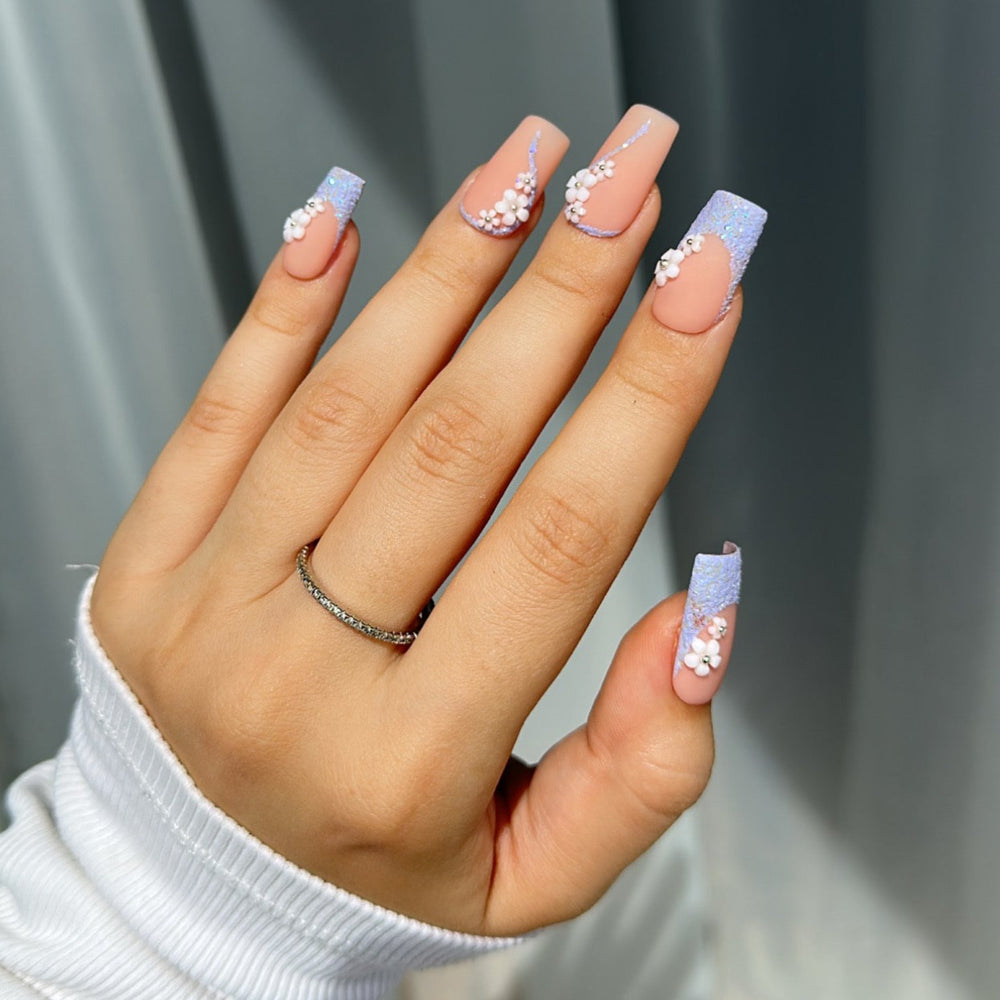Press-On Nehty Island Girl jsou nádherným třpytivým fialovým designem, doplněným něžnými květinkami. Ideální pro letní dovolenou. Díky technice press-on si nehty můžeš nalepit, ať už na jednorázovou událost nebo i na celé dva týdny. Stačí si vybrat délku a tvar!