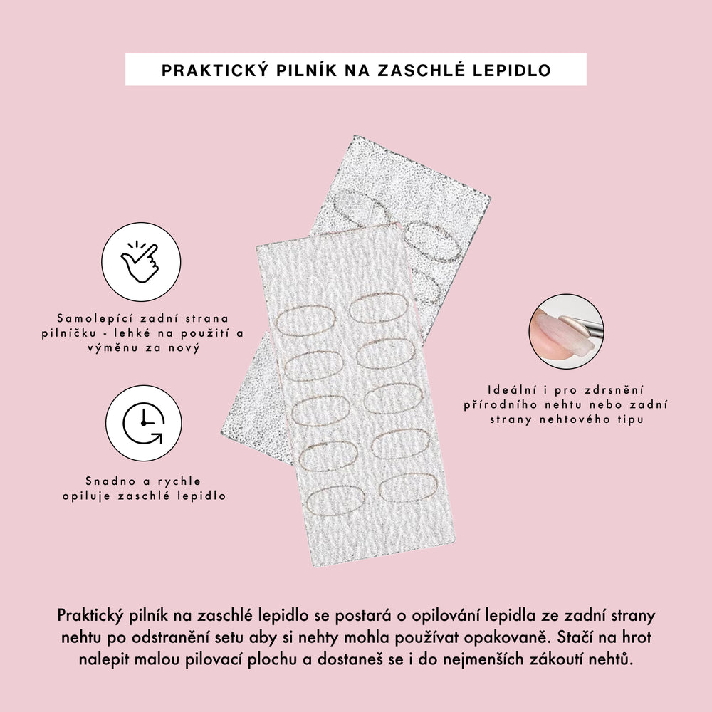 Praktický pilník na zaschlé lepidlo se postará o opilování zaschlého lepidla ze zadní strany nehtu po odstranění setu aby si nehty mohla používat opakovaně. Jelikož víme, že manipulace s klasickým pilníkem může být náročnější kvůli zahnuté ploše nehtu a ne každý má doma elektrickou brusku, tak jsme se snažili najít produkt, který tento problém vyřeší. A našli jsme ho! Stačí na hrot nalepit malou pilovací plochu a dostaneš se i do nejmenších zákoutí nehtů.