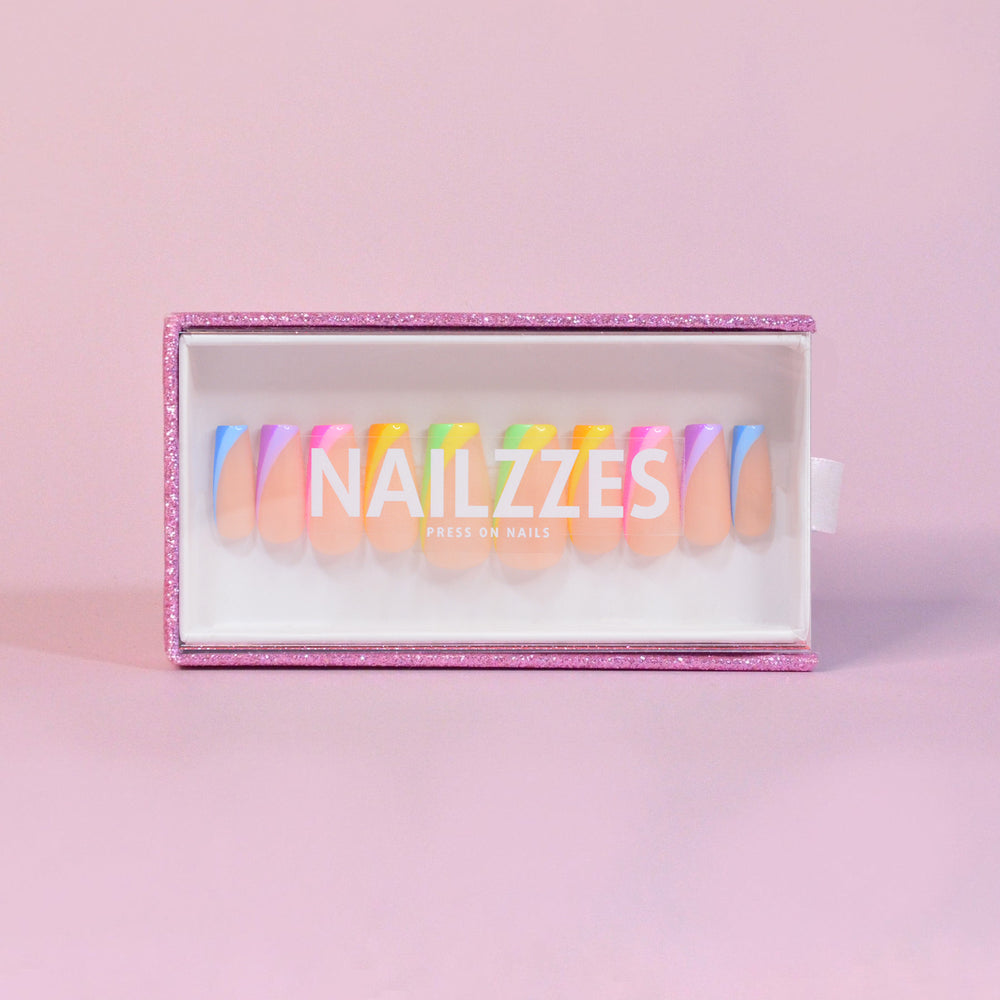 Nalepovací nehty Rainbow Lines zaručeně rozzáří tvou kolekci krásnými barvami. Zajímavé provedení boční špičky vnese nový vítr do tvého života. Díky revoluční technice press-on si nehty můžeš užít, ať už na jednorázovou událost nebo i během celých dvou týdnů. Stačí si vybrat délku!