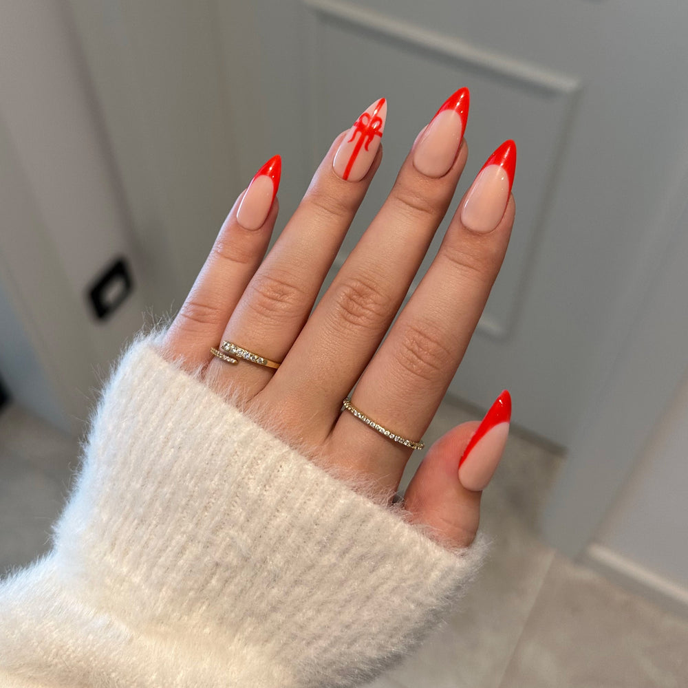 Press-on nehty Your Cute Gift jsou jednoduchá francouzská manikúra v červeném provedení doplněná jemným detailem stuhy z dárku. Ideální pro vánoční a zimní období.