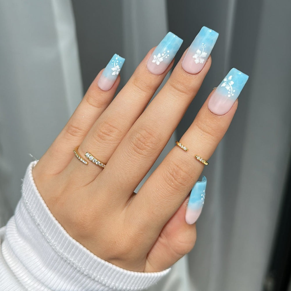 Press-On Nehty Waikiki jsou inspirovány ikonickou pláží Waikiki Beach na Havaji. Trendy ombré s motivem moře, které ovládlo sociální sítě, je doplněno něžnými exotickými květinami, které ta přenesou přímo do ráje.