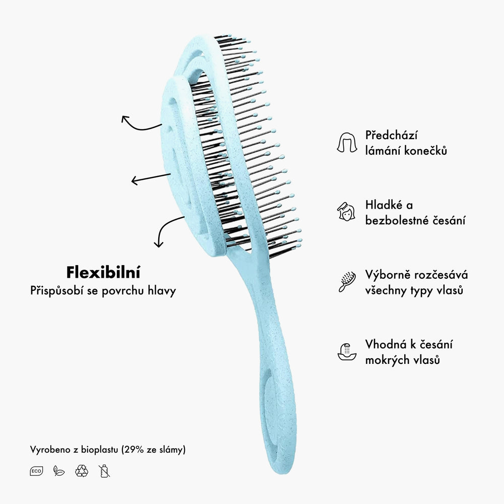 Dbáme na udržitelnost! Náš kartáč je vyroben z bioplastu obsahujícího recyklované materiály. Přináší nejen optimální péči o vlasy, ale také příjemnou masáž pokožky hlavy, která podpoří zdravý růst vlasů.