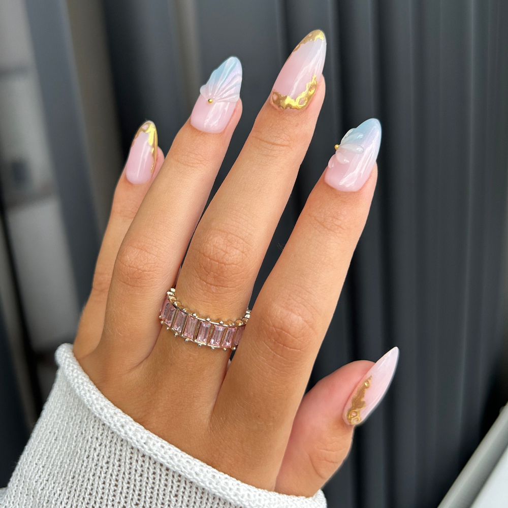 Press-On nehty Aquamarine jsou z letní kolekce inspirovány mořskou pannou. Jemné modré ombré je ozdobeno 3D designy, připomínající moře. Zlaté detaily dodávají nehtům luxus a letní přímořský styl. Nehty mají jemný perleťový odlesk.