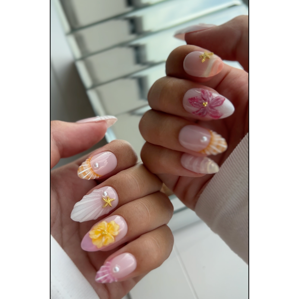 Press-On nehty Coral Reef jsou z letní kolekce inspirovány mořskou pannou. Obě ruce jsou unikátní a na každém prstu je jiný letní design, který připomíná svěží letní dovolenou a nekončící letní zážitky.