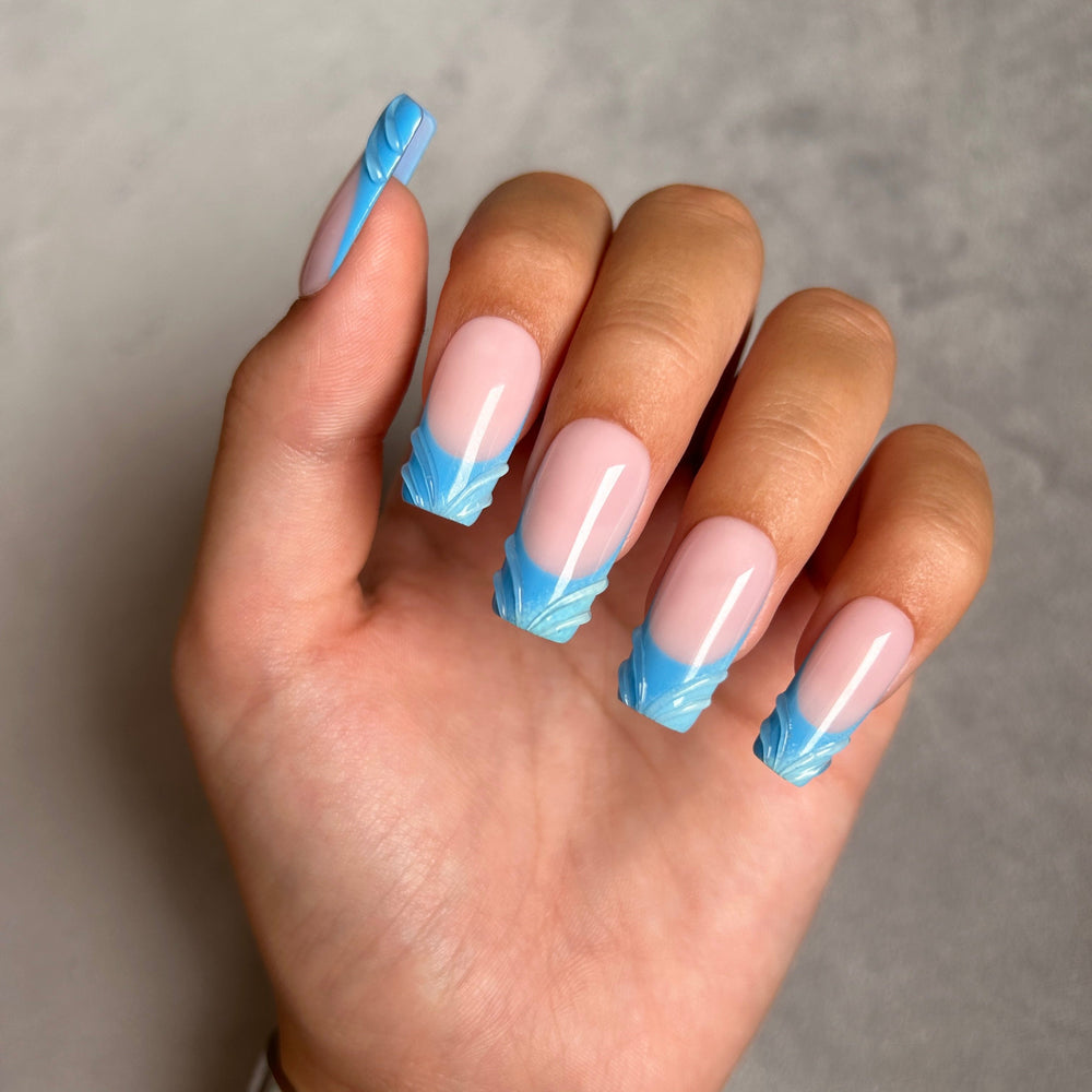 Press-On nehty Mermaid's Kiss jsou z letní kolekce inspirovány mořskou pannou. Ombré francouzská špička je doplněna o 3D design, připomínající ploutev mořské panny nebo vlny moře. Tento design je na jedné ruce fialový a na druhé tyrkysově modrý a dokonale tak odráží hravost ploutví mořské panny.